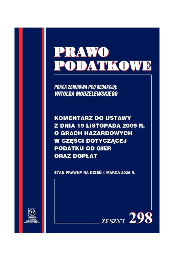 Oddajemy do rąk Czytelników Komentarz do ustawy z dnia 19 listopada 2009r. o grach hazardowych w części dotyczącej podatku od gier oraz dopłat publicznych wprowadzonych ustawą. Podatek od gier oraz dopłaty były jak dotąd tematem rzadko poruszanym w pismach prawniczych. Niniejsza publikacja ma na celu przybliżenie czytelnikowi specyficznej tematyki prawnej podatku od gier oraz dopłat w sposób profesjonalny z uwzględnieniem dorobku interpretacyjnego sądów i organów podatkowych w świetle stanu prawnego obowiązującego na dzień 1 marca 2026 r. Mamy nadzieję że niniejsza publikacja przyczyni się do przybliżenia tematyki podatku od gier i dopłat. Książka powstała przy udziale pracy studentów Wydziału Prawa i Administracji Uniwersytetu Warszawskiego pod opieką merytoryczną prof. dr hab. Witolda Modzelewskiego oraz pracowników Instytutu Studiów Podatkowych. Książka dotyczy stanu prawnego na dzień 1 marca 2026 r.