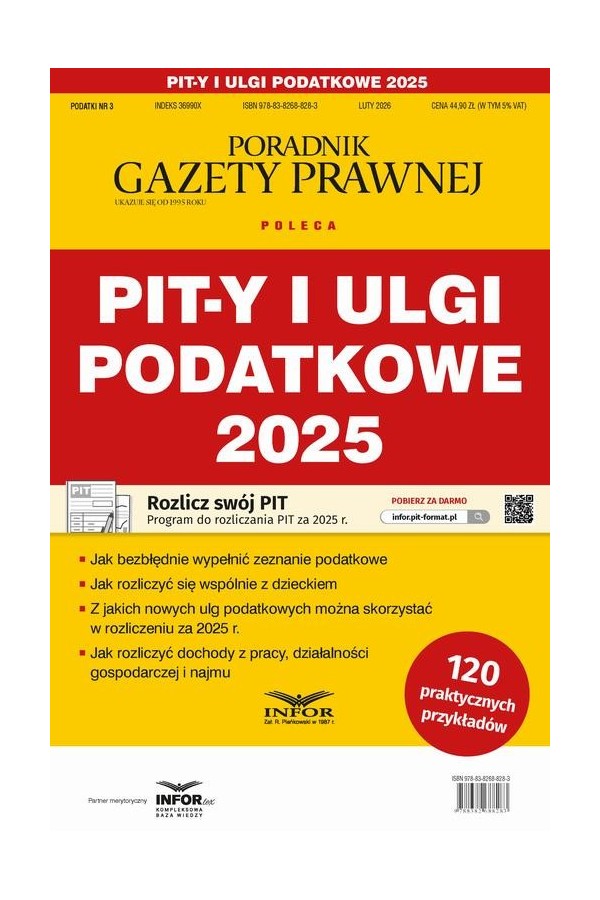 PIT-y i ulgi podatkowe 2025” to wyjątkowa publikacja na rynku wydawniczym. Zawiera komplet informacji, jak prawidłowo sporządzić zeznanie roczne za 2025 r. oraz skorzystać z ulg podatkowych – w tym po raz pierwszy z ulgi z tytułu zatrudniania żołnierzy WOT i aktywnej rezerwy. Główną zaletą poradnika jest praktyczny komentarz wzbogacony o 120 przykładów – w tym przykładów liczbowych wraz z wypełnionymi zeznaniami: ● PIT-28, ● PIT-36, ● PIT-36S, ● PIT-36L, ● PIT-37, ● PIT-38, ● PIT-39. W poradniku znajdziesz odpowiedzi na nurtujące Cię pytania i dowiesz się m.in.: ● jak bezbłędnie wypełnić zeznanie podatkowe, ● w jaki sposób skorzystać ze wspólnego rozliczenia z dzieckiem, ● jak rozliczyć przychody z najmu prywatnego, ● z jakich ulg podatkowych można skorzystać w rozliczeniu w rozliczeniu za 2025 r., ● jak rozliczyć dochody z pracy i działalności gospodarczej i najmu. Do publikacji dołączony jest również program, który pomoże z łatwością sporządzić zeznanie roczne za 2025 r. Autor publikacji jest doradcą podatkowym, który na co dzień odpowiada na pytania dotyczące podatku dochodowego. Na swoim koncie ma setki artykułów oraz liczne publikacje książkowe na ten temat. Sprawdź, co doradzi Ci ekspert, dzięki czemu zeznanie PIT za 2025 r. sporządzisz bezbłędnie.