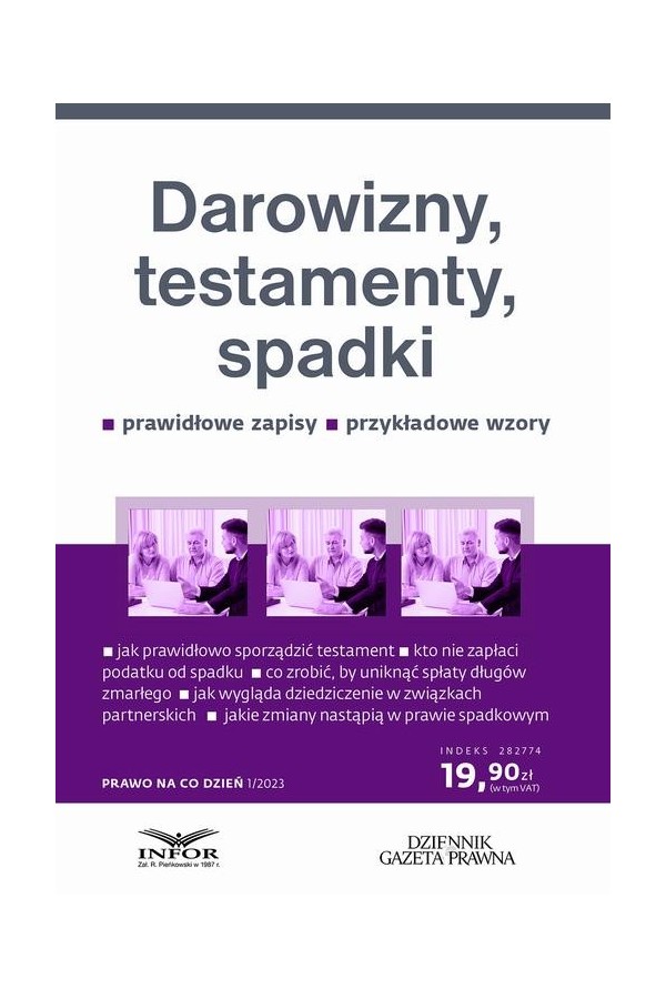 Praktyczna publikacja, która pomoże zaplanować wszystkie czynności związane z przekazaniem majątku m.in. na wypadek śmierci. Autorka bardzo przystępnie wyjaśnia, jak prawidłowo i zgodnie z prawem dokonać darowizny, zawrzeć umowę o dożywocie bądź sporządzić testament. Szczegółowo omawia też zasady dziedziczenia ustawowego, skutki przyjęcia spadku, a także zmiany, jakie są planowane w tym zakresie. Czytelnik dowie się z książki m.in.: ¦ kiedy testament ustny jest ważny, ¦ ile czasu ma spadkobierca na odrzucenie spadku, ¦ jak sporządzić wniosek o stwierdzenie nabycia spadku do sądu, ¦ czym jest zapis testamentowy, ¦ kto może żądać zachowku. Ponadto poradnik wyjaśnia: ¦ jakie są rodzaje testamentów, ¦ jak przebiega dział spadku, ¦ na jakich zasadach dziedziczą dzieci w rodzinie zastępczej, ¦ jakie dane można uzyskać w Rejestrze Spadkowym, ¦ gdzie znaleźć informacje o rachunkach bankowych zmarłego, ¦ jak odrzucić spadek, ¦ co dzieje się z małą firmą po śmierci właściciela, ¦ kto może dziedziczyć gospodarstwo rolne, ¦ czym jest umowa o dożywocie, ¦ jak prawidłowo zawrzeć umowę darowizny, ¦ czy darowizna wpływa na dziedziczenie. Poradnik zawiera także wzory umów, testamentów i wniosków w postepowaniu spadkowym. Objaśnia znaczenie najważniejszych postanowień umowy darowizny oraz umowy o dożycie, które często są stosowane, aby jeszcze za życia przekazać majątek wskazanym osobom. Autorka poświęca także uwagę opodatkowaniu otrzymanych spadków i darowizn. Wskazuje, kto może nie płacić podatku, a także jak obliczyć należny podatek i jaką deklarację należy przedłożyć do urzędu skarbowego. ATUTY PUBLIKACJI: Prosty język, praktyczne przykłady, wzory umów i wniosków, informacje o wysokości opłat sądowych i notarialnych sprawiają, że jest to najlepszy tego typu poradnik na polskim rynku.